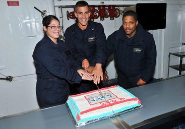 | Keywords: 151013-N-VY489-004 ATLANTIC OCEAN (Oct. 13, 2015) Capt. Carlos Sardiello (center), Lt. Mark Reddy (right), and Interior Communications Electrician Seaman Kiara Morales Rivera , cut a cake commemorating the Navy's 240th birthday aboard the U.S 6th Fleet command and control ship USS Mount Whitney (LCC 20) Oct. 13, 2015. Mount Whitney, forward deployed to Gaeta, Italy, operates with a combined crew of U.S. Navy Sailors and Military Sealift Command civil service mariners. (U.S. Navy photo by Mass Communications Specialist 1st Class Mike Wright/ Released) 151013-N-VY489-004 ATLANTIC OCEAN (Oct. 13, 2015) Capt. Carlos Sardiello (center), Lt. Mark Reddy (right), and Interior Communications Electrician Seaman Kiara Morales Rivera , cut a cake commemorating the Navy's 240th birthday aboard the U.S 6th Fleet command and control ship USS Mount Whitney (LCC 20) Oct. 13, 2015. Mount Whitney, forward deployed to Gaeta, Italy, operates with a combined crew of U.S. Navy Sailors and Military Sealift Command civil service mariners. (U.S. Navy photo by Mass Communications Specialist 1st Class Mike Wright/ Released) 151013-N-VY489-004 ATLANTIC OCEAN (Oct. 13, 2015) Capt. Carlos Sardiello (center), Lt. Mark Reddy (right), and Interior Communications Electrician Seaman Kiara Morales Rivera , cut a cake commemorating the Navy's 240th birthday aboard the U.S 6th Fleet command and control ship USS Mount Whitney (LCC 20) Oct. 13, 2015. Mount Whitney, forward deployed to Gaeta, Italy, operates with a combined crew of U.S. Navy Sailors and Military Sealift Command civil service mariners. (U.S. Navy photo by Mass Communications Specialist 1st Class Mike Wright/ Released) 151013-N-VY489-004 ATLANTIC OCEAN (Oct. 13, 2015) Capt. Carlos Sardiello (center), Lt. Mark Reddy (right), and Interior Communications Electrician Seaman Kiara Morales Rivera , cut a cake commemorating the Navy's 240th birthday aboard the U.S 6th Fleet command and control ship USS Mount Whitney (LCC 20) Oct. 13, 2015. Mount Whitney, forward deployed to Gaeta, Italy, operates with a combined crew of U.S. Navy Sailors and Military Sealift Command civil service mariners. (U.S. Navy photo by Mass Communications Specialist 1st Class Mike Wright/ Released) |