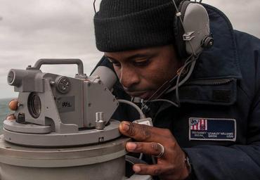 MAKE A MEME View Large Image Quartermaster Seaman Stanley Williams, from Montgomery, Alabama, takes a bearing using an alidade aboard USS Carney (DDG 64) as the ship prepares to pull into Brest, France, Nov. 13, 2015. Carney, an Arleigh Burke-class guided-missile ...