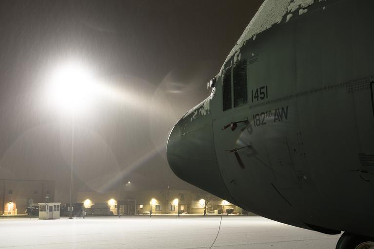 MAKE A MEME View Large Image Snow falls on a C-130 Hercules aircraft assigned to the 182nd Airlift Wing, Illinois Air National Guard, in Peoria, Ill., Dec. 30, 2015. That day’s snow was the first measurable snowfall since a record 4.6 inches fell on Nov. 21. (U.S. ...