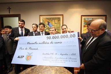 | Keywords: devolução cheque simbólico chequesimbólico 90 milhões 90milhões economia alep legislativo paranaense legislativoparanaense pedro lupion pedrolupion plauto miró plautomiró beto richa betoricha elio rusch eliorusch gilson de souza gilsondesouza luiz accorsi luizaccorsi groupshot people indoor A Assembleia Legislativa devolveu ao Governo do Estado R$ 90 milhões, resultado das economias pelas medidas moralizadoras e saneadoras implantadas no primeiro ano de gestão da atual Mesa Executiva. O valor foi entregue ao governador Beto Richa (PSDB) no início da tarde desta quinta-feira (15), em ato simbólico realizado na Presidência do Poder Legislativo, na presença de diversos deputados, diretores, além de secretários de Estado. Leia mais: www.alep.pr.gov.br/imprensa/noticias/noticia/20847/assemb... Foto: Nani Gois/Alep (crédito obrigatório) A Assembleia Legislativa devolveu ao Governo do Estado R$ 90 milhões, resultado das economias pelas medidas moralizadoras e saneadoras implantadas no primeiro ano de gestão da atual Mesa Executiva. O valor foi entregue ao governador Beto Richa (PSDB) no início da tarde desta quinta-feira (15), em ato simbólico realizado na Presidência do Poder Legislativo, na presença de diversos deputados, diretores, além de secretários de Estado. Leia mais: www.alep.pr.gov.br/imprensa/noticias/noticia/20847/assemb... Foto: Nani Gois/Alep (crédito obrigatório) |