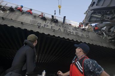 | Keywords: usns spearhead (t-epf 1) usnsspearheadtepf1 outdoor 160109-N-WV703-177 ROTA, Spain (Jan. 9, 2015) Ship's Serviceman Seaman Dylan Smith, a search-and-rescue swimmer, left, and Boatswain's Mate 2nd Class Ryan Feeney approach USNS Spearhead (T-EPF 1) during small boat operations Jan. 9, 2016. The Military Sealift Command expeditionary fast transport vessel USNS Spearhead is on a scheduled deployment in the U.S. 6th Fleet area of operations to support the international collaborative capacity-building program Africa Partnership Station. (U.S. Navy photo by Mass Communication Specialist 3rd Class Amy M. Ressler/Released) 160109-N-WV703-177 ROTA, Spain (Jan. 9, 2015) Ship's Serviceman Seaman Dylan Smith, a search-and-rescue swimmer, left, and Boatswain's Mate 2nd Class Ryan Feeney approach USNS Spearhead (T-EPF 1) during small boat operations Jan. 9, 2016. The Military Sealift Command expeditionary fast transport vessel USNS Spearhead is on a scheduled deployment in the U.S. 6th Fleet area of operations to support the international collaborative capacity-building program Africa Partnership Station. (U.S. Navy photo by Mass Communication Specialist 3rd Class Amy M. Ressler/Released) |