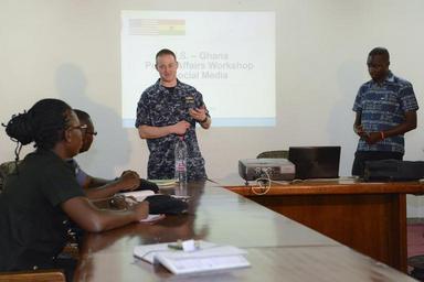 | Keywords: indoor 160122-N-UE250-030 ACCRA, Ghana (Jan. 21, 2016) Lt. Adam Cole, center, assigned to U.S. Naval Forces Europe-Africa/U.S. 6th Fleet answers questions about the U.S. Navy’s policy on public affairs, while in Accra, Ghana, Jan. 21, 2016. Cole was in Accra to coordinate a Public Affairs Workshop designed to allow service members from each nation to share ideas and standard operating practices of the public affairs mission. The event was part of Africa Partnership Station, an international collaborative capacity-building program, with various nations working alongside African partners to enhance maritime security. (U.S. Navy photo by Mass Communication Specialist 2nd Class Corey Hensley/Released) 160122-N-UE250-030 ACCRA, Ghana (Jan. 21, 2016) Lt. Adam Cole, center, assigned to U.S. Naval Forces Europe-Africa/U.S. 6th Fleet answers questions about the U.S. Navy’s policy on public affairs, while in Accra, Ghana, Jan. 21, 2016. Cole was in Accra to coordinate a Public Affairs Workshop designed to allow service members from each nation to share ideas and standard operating practices of the public affairs mission. The event was part of Africa Partnership Station, an international collaborative capacity-building program, with various nations working alongside African partners to enhance maritime security. (U.S. Navy photo by Mass Communication Specialist 2nd Class Corey Hensley/Released) |