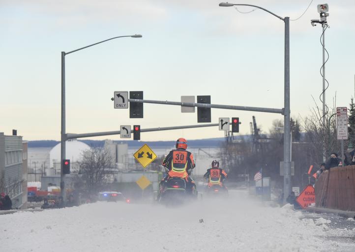 Keywords: 2016 iron dog 2016irondog alaska national guard alaskanationalguard snowmobile anchorage alaska usa us outdoor sport snow Snowmobile racers leave the starting line during the opening ceremony for the 2016 Iron Dog race in Anchorage, Alaska, Feb. 20. This year 41 two-man teams are competing in the over 2,000 mile long race that stretches from Big Lake to Nome, and finishes in Fairbanks. The racers must traverse some of Alaska’s most remote and rugged terrain while confronting harsh winter conditions. (U.S. Air Force photo/Alejandro Peña) Snowmobile racers leave the starting line during the opening ceremony for the 2016 Iron Dog race in Anchorage, Alaska, Feb. 20. This year 41 two-man teams are competing in the over 2,000 mile long race that stretches from Big Lake to Nome, and finishes in Fairbanks. The racers must traverse some of Alaska’s most remote and rugged terrain while confronting harsh winter conditions. (U.S. Air Force photo/Alejandro Peña) |