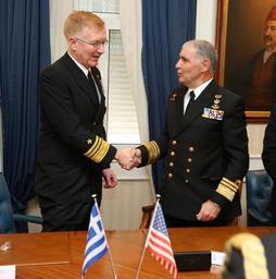 | Keywords: indoor 160223-ZZ999-009 ATHENS, Greece (Feb. 23, 2016) Vice Adm. James Foggo, III, Commander, U.S. 6th Fleet, left, and Vice Adm. Georgios Giakoumakis, Chief Hellenic Navy General Staff, shake hands during a meeting at Hellenic Ministry of National Defense Feb. 23, 2016. Foggo was in Athens for the signing of an agreement for the construction and operation of a new deep-water degaussing facility which will aid vessels from the U.S., Greece, NATO, and other countries in maintaining operational readiness. U.S. 6th Fleet, headquartered in Naples, Italy, conducts the full spectrum of joint and naval operations, often in concert with allied, joint, and interagency partners, in order to advance U.S. national interests and security and stability in Europe and Africa. (Photo courtesy of Hellenic Navy/Released) 160223-ZZ999-009 ATHENS, Greece (Feb. 23, 2016) Vice Adm. James Foggo, III, Commander, U.S. 6th Fleet, left, and Vice Adm. Georgios Giakoumakis, Chief Hellenic Navy General Staff, shake hands during a meeting at Hellenic Ministry of National Defense Feb. 23, 2016. Foggo was in Athens for the signing of an agreement for the construction and operation of a new deep-water degaussing facility which will aid vessels from the U.S., Greece, NATO, and other countries in maintaining operational readiness. U.S. 6th Fleet, headquartered in Naples, Italy, conducts the full spectrum of joint and naval operations, often in concert with allied, joint, and interagency partners, in order to advance U.S. national interests and security and stability in Europe and Africa. (Photo courtesy of Hellenic Navy/Released) |