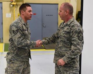 | Keywords: air force usaf 182 aw airlift wing peoria illinois ill il ang national guard ngb z northcom command chief hotaling cmsgt town hall meeting leadership visit enlisted corps profession arms aim points coin coining usa us people U.S. Air Force Staff Sgt. Nicholas A. Urquiza, left, an air transportation specialist with the 182nd Logistics Readiness Squadron, Illinois Air National Guard, receives a coin from Chief Master Sgt. James W. Hotaling, the command chief of the Air National Guard, during an enlisted corps forum at the 182nd Airlift Wing, Illinois Air National Guard, in Peoria, Ill., March 4, 2016. Hotaling visited the base to discuss renewing the commitment to the profession of arms, the health of the force and embracing accomplishments. (U.S. Air National Guard photo by Master Sgt. Scott Thompson) U.S. Air Force Staff Sgt. Nicholas A. Urquiza, left, an air transportation specialist with the 182nd Logistics Readiness Squadron, Illinois Air National Guard, receives a coin from Chief Master Sgt. James W. Hotaling, the command chief of the Air National Guard, during an enlisted corps forum at the 182nd Airlift Wing, Illinois Air National Guard, in Peoria, Ill., March 4, 2016. Hotaling visited the base to discuss renewing the commitment to the profession of arms, the health of the force and embracing accomplishments. (U.S. Air National Guard photo by Master Sgt. Scott Thompson) |