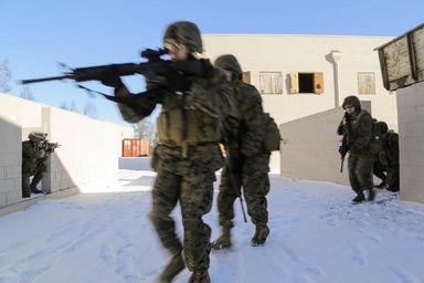 | Keywords: 4th law enforcement battalion 4thlawenforcementbattalion mout military operation on urban terrain militaryoperationonurbanterrain military police militarypolice joint base elmendorf-richardson jointbaseelmendorfrichardson alaska usa us outdoor sport snow Marines assigned to Detachment Military Police Company D, 4th Law Enforcement Battalion conduct military operations on urban terrain (MOUT) training at Baumeister City MOUT complex at Joint Base Elmendorf-Richardson, Alaska, March 6, 2016. The training prepared the Marines for their upcoming deployment to Serbia where they will serve as military police advisors. (U.S. Air Force photos/Alejandro Peña) Marines assigned to Detachment Military Police Company D, 4th Law Enforcement Battalion conduct military operations on urban terrain (MOUT) training at Baumeister City MOUT complex at Joint Base Elmendorf-Richardson, Alaska, March 6, 2016. The training prepared the Marines for their upcoming deployment to Serbia where they will serve as military police advisors. (U.S. Air Force photos/Alejandro Peña) |