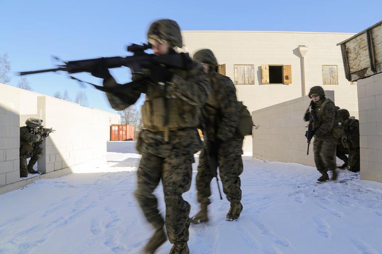 Keywords: 4th law enforcement battalion 4thlawenforcementbattalion mout military operation on urban terrain militaryoperationonurbanterrain military police militarypolice joint base elmendorf-richardson jointbaseelmendorfrichardson alaska usa us outdoor sport snow Marines assigned to Detachment Military Police Company D, 4th Law Enforcement Battalion conduct military operations on urban terrain (MOUT) training at Baumeister City MOUT complex at Joint Base Elmendorf-Richardson, Alaska, March 6, 2016. The training prepared the Marines for their upcoming deployment to Serbia where they will serve as military police advisors. (U.S. Air Force photos/Alejandro Peña) Marines assigned to Detachment Military Police Company D, 4th Law Enforcement Battalion conduct military operations on urban terrain (MOUT) training at Baumeister City MOUT complex at Joint Base Elmendorf-Richardson, Alaska, March 6, 2016. The training prepared the Marines for their upcoming deployment to Serbia where they will serve as military police advisors. (U.S. Air Force photos/Alejandro Peña) |