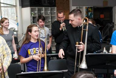 | Keywords: clinic colonial forge high school colonialforgehighschool commodores navy navy band navyband big band bigband education jazz music outreach 160412-N-DD694-003 STAFFORD, Va. (April 12, 2016) Musician 1st Class Ben Ford (front) and MU1 Thomas Eby (rear) demonstrate big band performance techniques to students at Colonial Forge High School. MU1 Ford and MU1 Eby are members of the U.S. Navy Band Commodores jazz ensemble, which provides educational outreach to young musicians throughout the year. (U.S. Navy photo by Musician 1st Class Jonathan Barnes/Released) 160412-N-DD694-003 STAFFORD, Va. (April 12, 2016) Musician 1st Class Ben Ford (front) and MU1 Thomas Eby (rear) demonstrate big band performance techniques to students at Colonial Forge High School. MU1 Ford and MU1 Eby are members of the U.S. Navy Band Commodores jazz ensemble, which provides educational outreach to young musicians throughout the year. (U.S. Navy photo by Musician 1st Class Jonathan Barnes/Released) |