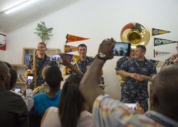 | Keywords: africa partnership station 2016; aps16; aps; c6f; usns; spearhea africapartnershipstation2016aps16apsc6fusnsspearhea libreville, gabon librevillegabon africa partnership station 2016; aps16; aps; c6f; usns; spearhead; navy; partnership; military sealift command; u.s. navy; navy; africapartnershipstation2016aps16apsc6fusnsspearheadnavypartnershipmilitarysealiftcommandusnavynavy 160413-N-QF605-265 LIBREVILLE, Gabon (April 13, 2016) - Gabon locals take photos of the U.S. Naval Forces Europe Band “Topside” as they perform at American Corner in Libreville, Gabon, April 13, 2016. American Corner is an American cultural center that aims to promote U.S. culture in Gabon. (U.S. Navy photo by Mass Communication Specialist 1st Class Amanda Dunford/Released) 160413-N-QF605-265 LIBREVILLE, Gabon (April 13, 2016) - Gabon locals take photos of the U.S. Naval Forces Europe Band “Topside” as they perform at American Corner in Libreville, Gabon, April 13, 2016. American Corner is an American cultural center that aims to promote U.S. culture in Gabon. (U.S. Navy photo by Mass Communication Specialist 1st Class Amanda Dunford/Released) |
