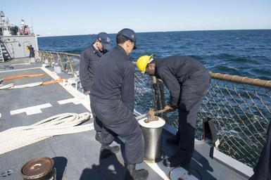 | Keywords: u.s. navy usnavy navy mc navymc nsa naples nsanaples npase-east npaseeast navy public affairs navypublicaffairs sailors marines europe italy nato outdoor 160422-N-TC720-138 BALTIC SEA (April 23, 2016) - Boatswain's Mate 2nd Class Mario Sanders, from Montgomery, Alabama, right, and Logistics Specialist 3rd Class Gabriel Flores, from Norfolk, Virginia, left, haul up a retractable bitt aboard USS Donald Cook (DDG 75) as the ship pulls into Kiel, Germany, for a scheduled port visit April 23, 2016. Donald Cook, an Arleigh Burke-class guided-missile destroyer, forward deployed to Rota, Spain is conducting a routine patrol in the U.S. 6th Fleet area of operations in support of U.S. national security interests in Europe. (U.S. Navy photo by Mass Communication Specialist 2nd Class Mat Murch/Released) 160422-N-TC720-138 BALTIC SEA (April 23, 2016) - Boatswain's Mate 2nd Class Mario Sanders, from Montgomery, Alabama, right, and Logistics Specialist 3rd Class Gabriel Flores, from Norfolk, Virginia, left, haul up a retractable bitt aboard USS Donald Cook (DDG 75) as the ship pulls into Kiel, Germany, for a scheduled port visit April 23, 2016. Donald Cook, an Arleigh Burke-class guided-missile destroyer, forward deployed to Rota, Spain is conducting a routine patrol in the U.S. 6th Fleet area of operations in support of U.S. national security interests in Europe. (U.S. Navy photo by Mass Communication Specialist 2nd Class Mat Murch/Released) |