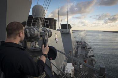 | Keywords: uss porter (ddg 78) ussporterddg78 destroyer aft port side portside port said portsaid suez canal suezcanal midshipman ship binoculars shipbinoculars 160508-N-FQ994-022 PORT SAID (May 8, 2016) Midshipman Robert Keenan, from Carnegie Mellon University Steel City Naval ROTC, peers through ship binoculars aboard USS Porter (DDG 78) as the ship transits Port Said to enter the Suez Canal en route to the Red Sea May 8, 2016. Porter, an Arleigh Burke-class guided-missile destroyer, forward-deployed to Rota, Spain, is conducting a routine patrol in the U.S. 6th Fleet area of operations in support of U.S. national security interests in Europe. (U.S. Navy Photo by Mass Communication Specialist 3rd Class Robert S. Price/Released) 160508-N-FQ994-022 PORT SAID (May 8, 2016) Midshipman Robert Keenan, from Carnegie Mellon University Steel City Naval ROTC, peers through ship binoculars aboard USS Porter (DDG 78) as the ship transits Port Said to enter the Suez Canal en route to the Red Sea May 8, 2016. Porter, an Arleigh Burke-class guided-missile destroyer, forward-deployed to Rota, Spain, is conducting a routine patrol in the U.S. 6th Fleet area of operations in support of U.S. national security interests in Europe. (U.S. Navy Photo by Mass Communication Specialist 3rd Class Robert S. Price/Released) |