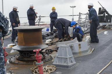 | Keywords: u.s. navy usnavy navy mc navymc nsa naples nsanaples npase-east npaseeast navy public affairs navypublicaffairs sailors marines europe italy nato rota spain 160509-N-TC720-117 ROTA, Spain (May 9, 2016) Sailors aboard USS Donald Cook (DDG 75) secure the ship’s anchor chain to the pelican hooks May 9, 2016. Donald Cook, an Arleigh Burke-class guided-missile destroyer, forward deployed to Rota, Spain is conducting a routine patrol in the U.S. 6th Fleet area of operations in support of U.S. national security interests in Europe. (U.S. Navy photo by Mass Communication Specialist 2nd Class Mat Murch/Released) 160509-N-TC720-117 ROTA, Spain (May 9, 2016) Sailors aboard USS Donald Cook (DDG 75) secure the ship’s anchor chain to the pelican hooks May 9, 2016. Donald Cook, an Arleigh Burke-class guided-missile destroyer, forward deployed to Rota, Spain is conducting a routine patrol in the U.S. 6th Fleet area of operations in support of U.S. national security interests in Europe. (U.S. Navy photo by Mass Communication Specialist 2nd Class Mat Murch/Released) |