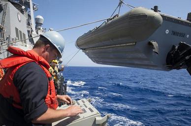 | Keywords: uss porter (ddg 78) ussporterddg78 boatswain's mate boatswainsmate slewing arm davit slewingarmdavit mediterranean sea mediterraneansea outdoor 160511-N-FQ994-046 MEDITERRANEAN SEA (May 11, 2016) Boatswain's Mate 2nd Class Isiah Price, from Warner Robins, Georgia, lowers a rigid-hull inflatable boat from USS Porter (DDG 78) by using the ship's slewing arm davit May 11, 2016. Porter, an Arleigh Burke-class guided-missile destroyer, forward-deployed to Rota, Spain, is conducting a routine patrol in the U.S. 6th Fleet area of operations in support of U.S. national security interests in Europe. (U.S. Navy Photo by Mass Communication Specialist 3rd Class Robert S. Price/Released) 160511-N-FQ994-046 MEDITERRANEAN SEA (May 11, 2016) Boatswain's Mate 2nd Class Isiah Price, from Warner Robins, Georgia, lowers a rigid-hull inflatable boat from USS Porter (DDG 78) by using the ship's slewing arm davit May 11, 2016. Porter, an Arleigh Burke-class guided-missile destroyer, forward-deployed to Rota, Spain, is conducting a routine patrol in the U.S. 6th Fleet area of operations in support of U.S. national security interests in Europe. (U.S. Navy Photo by Mass Communication Specialist 3rd Class Robert S. Price/Released) |