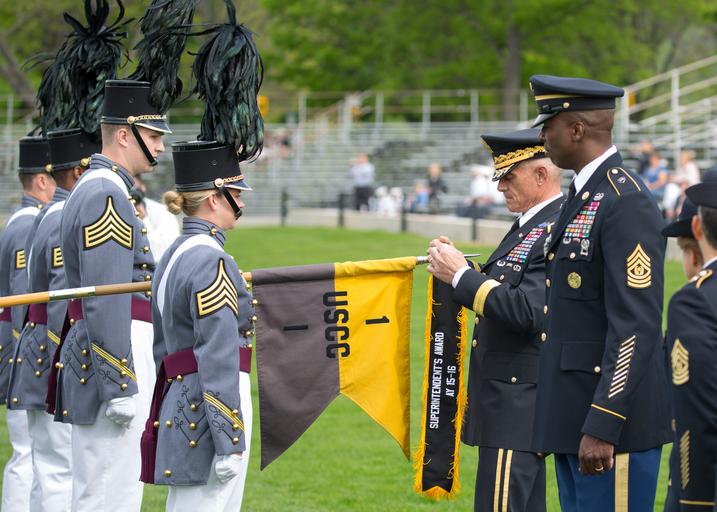 Keywords: cadets awards review awardsreview class of 2016 classof2016 academics athletics superintendent caslen holland commandant outdoor Superintendent of the U.S. Military Academy, Lt. Gen. Robert L. Caslen, Jr., and Commandant of the U.S. Corps of Cadets, Brig. Gen. Diana Holland, present award streamers for excellence during the 2015-2016 academic year, May 18 at West Point. (U.S. Army photo by: Staff Sgt. Vito T. Bryant) Superintendent of the U.S. Military Academy, Lt. Gen. Robert L. Caslen, Jr., and Commandant of the U.S. Corps of Cadets, Brig. Gen. Diana Holland, present award streamers for excellence during the 2015-2016 academic year, May 18 at West Point. (U.S. Army photo by: Staff Sgt. Vito T. Bryant)