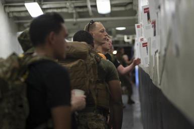 | Keywords: 160528-N-KR961-307 160528-N-KR961-307.jpg en 160528-N-KR961-307 GULF OF ADEN May 28 2016 Sailors and Marines pause to read biographies of fallen servicemembers on the flight deck access ramp during a Memorial Day sunrise ruck march on the flight deck of amphibious assault ship USS Boxer LHD 4 Boxer is the flagship for the Boxer Amphibious Ready Group and with the embarked 13th Marine Expeditionary Unit is deployed in support of maritime security operations and theater security cooperation efforts in the U S 5th Fleet area of operations U S Navy photo by Mass Communication Specialist 2nd Class Debra Daco/Released Unit Navy Media Content Services DVIDS Tags Ruck March; USS Boxer LHD 4 ; Amphibious Ready Group; U S Navy; 13th MEU; 13th Marine Expeditionary Unit; NMCS; CPR-1; DVIDS Bulk Import; BOXARG13MEU16; Memorial Observance 2016-05-28 Petty Officer 2nd Class Debra Daco https //www dvidshub net/image/2627362/160528-n-kr961-307 160528-N-KR961-307 2016-06-01 00 25 GULF OF ADEN PD-USGov-Military-Navy 13th Marine Expeditionary Unit USS Boxer LHD-4 Images from DoD uploaded by Fæ |