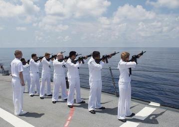 | Keywords: 160530-N-OR184-061 160530-N-OR184-061.jpg en SOUTH CHINA SEA May 30 2016 -- Sailors aboard the guided-missile destroyer USS William P Lawrence DDG 110 render a 21-gun salute during the Memorial Day ceremony in honor of Chief Special Warfare Operator SEAL Charles H Keating IV who was killed in action on May 3 Providing a ready force supporting security and stability in the Indo-Asia-Pacific William P Lawrence commanded by Cmdr Walter C Mainor is operating as part of the John C Stennis Strike Group and Great Green Fleet on a regularly scheduled 7th Fleet deployment U S Navy photo by Mass Communication Specialist Seaman Bill M Sanders/Released Unit Navy Media Content Services DVIDS Tags John C Stennis Strike Group; USS William P Lawrence DDG 110 ; Great Green Fleet; NMCS; DVIDS Bulk Import; JCSSG 2016-05-30 Petty Officer 3rd Class Emiline Senn https //www dvidshub net/image/2631761/160530-n-or184-061 160530-N-OR184-061 2016-06-03 00 07 SOUTH CHINA SEA PD-USGov-Military-Navy USS William P Lawrence DDG-110 Images from DoD uploaded by Fæ |