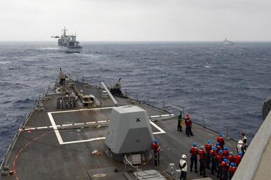 | Keywords: deployment csg 10 csg10 cvw 3 cvw3 ofrp uss mason ussmason ddg 87 ddg87 secnav itn its etna itsetna a5326 photoex biofuel ras alternative fuel alternativefuel outdoor vehicle boat 160616-N-KK394-007 MEDITERRANEAN SEA (June 16, 2016) â The guided-missile destroyer USS Mason (DDG 87) makes its approach to the Italian replenishment oiler ITNS Etna (A5236) prior to an alternative fuel replenishment-at-sea, a part of the Great Green Fleet initiative. Mason, deployed as part of the Eisenhower Carrier Strike Group, is conducting naval operations in the U.S. 6th Fleet area of operations in support of U.S. national security interests in Europe. (U.S. Navy photo by Mass Communication Specialist 3rd Class Anderson W. Branch/Released) 160616-N-KK394-007 MEDITERRANEAN SEA (June 16, 2016) â The guided-missile destroyer USS Mason (DDG 87) makes its approach to the Italian replenishment oiler ITNS Etna (A5236) prior to an alternative fuel replenishment-at-sea, a part of the Great Green Fleet initiative. Mason, deployed as part of the Eisenhower Carrier Strike Group, is conducting naval operations in the U.S. 6th Fleet area of operations in support of U.S. national security interests in Europe. (U.S. Navy photo by Mass Communication Specialist 3rd Class Anderson W. Branch/Released) |