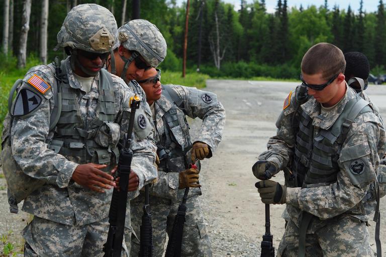 | Keywords: soldiers; army; u.s. army; u.s. army alaska; usarpac; u.s. army soldiersarmyusarmyusarmyalaskausarpacusarmy joint base elmendorf-richardson jointbaseelmendorfrichardson alaska usa soldiers; army; u.s. army; u.s. army alaska; usarpac; u.s. army pacific; ready warrior; competition; small unit; leadership; testing; training soldiersarmyusarmyusarmyalaskausarpacusarmypacificreadywarriorcompetitionsmallunitleadershiptestingtraining people outdoor Soldiers assigned to the 17th Combat Sustainment Support Battalion, U.S. Army Alaska, fit Blank Firing Adapters to their weapons before a Situation Exercise Training lane during the Ready Warrior Competition at Camp Madbull on Joint Base Elmendorf-Richardson, Alaska, Thursday, June 23, 2016. The three-day competition tested teams of Soldiers in physical fitness, small arms proficiency, land navigation, and small-unit tactics as well as other Soldier skills. (U.S. Air Force photo/Justin Connaher) Soldiers assigned to the 17th Combat Sustainment Support Battalion, U.S. Army Alaska, fit Blank Firing Adapters to their weapons before a Situation Exercise Training lane during the Ready Warrior Competition at Camp Madbull on Joint Base Elmendorf-Richardson, Alaska, Thursday, June 23, 2016. The three-day competition tested teams of Soldiers in physical fitness, small arms proficiency, land navigation, and small-unit tactics as well as other Soldier skills. (U.S. Air Force photo/Justin Connaher) |