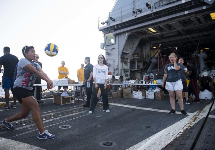| Keywords: 160703-N-OR652-269 160703-N-OR652-269.jpg en 160703-N-OR652-269MEDITERRANEAN SEA July 3 2016 Sailors assigned to the guided-missile cruiser USS San Jacinto CG 56 play volleyball during a steel beach picnic on the ship s flight deck San Jacinto is deployed in support of Operation Inherent Resolve maritime security operations and theater security operation efforts in the U S 6th Fleet area of operations U S Navy photo by Mass Communication Specialist 3rd Class J Alexander Delgado/Released <br>Unit Navy Media Content Services 2016-07-03 Petty Officer 3rd Class Alex Delgado https //www dvidshub net/image/2706239/160703-n-or652-269 160703-N-OR652-269 2016-07-06 00 08 PD-USGov-Military-Navy USS San Jacinto CG-56 Images from DoD uploaded by FĂŚ |