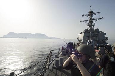 | Keywords: uss porter (ddg 78) ussporterddg78 scat the rock of gibralter therockofgibralter algeciras spain mooring lines mooringlines u.s. navy usnavy ddg 78 ddg78 uss porter ussporter porter mc3 robert price mc3robertprice outdoor 160709-N-FQ994-127 ALGECIRAS, Spain (July 9, 2016) Gunner's Mate 2nd Class Maeghan Goss, from Shermans Dale, Pennsylvania, front, searches for a surface contact from aboard USS Porter (DDG 78) as the ship sails past the Rock of Gibraltar en route to arrive in Algeciras, Spain July 9, 2016. Porter, an Arleigh Burke-class guided-missile destroyer, forward-deployed to Rota, Spain, is conducting a routine patrol in the U.S. 6th Fleet area of operations in support of U.S. national security interests in Europe. (U.S. Navy Photo by Mass Communication Specialist 3rd Class Robert S. Price/Released) 160709-N-FQ994-127 ALGECIRAS, Spain (July 9, 2016) Gunner's Mate 2nd Class Maeghan Goss, from Shermans Dale, Pennsylvania, front, searches for a surface contact from aboard USS Porter (DDG 78) as the ship sails past the Rock of Gibraltar en route to arrive in Algeciras, Spain July 9, 2016. Porter, an Arleigh Burke-class guided-missile destroyer, forward-deployed to Rota, Spain, is conducting a routine patrol in the U.S. 6th Fleet area of operations in support of U.S. national security interests in Europe. (U.S. Navy Photo by Mass Communication Specialist 3rd Class Robert S. Price/Released) |