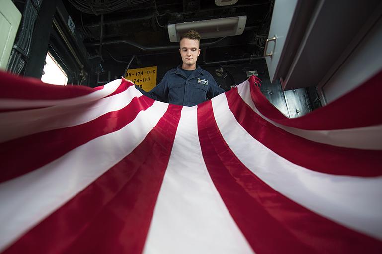 | Keywords: flag quartermaster sailor usn uss chancellorsville (cg 62) usschancellorsvillecg62 south china sea southchinasea U.S. Navy Quartermaster 3rd Class Scott Farrell folds the national ensign aboard the guided-missile cruiser USS Chancellorsville (CG 62) in the South China Sea, July 9, 2016. The Chancellorsville was on patrol with Carrier Strike Group Five (CSG 5) in the U.S. 7th Fleet area of responsibility supporting security and stability in the Indo-Asia-Pacific. (U.S. Navy photo by Mass Communication Specialist 2nd Class Andrew Schneider) U.S. Navy Quartermaster 3rd Class Scott Farrell folds the national ensign aboard the guided-missile cruiser USS Chancellorsville (CG 62) in the South China Sea, July 9, 2016. The Chancellorsville was on patrol with Carrier Strike Group Five (CSG 5) in the U.S. 7th Fleet area of responsibility supporting security and stability in the Indo-Asia-Pacific. (U.S. Navy photo by Mass Communication Specialist 2nd Class Andrew Schneider) |