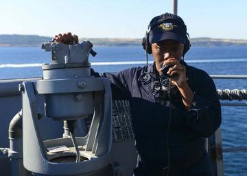 | Keywords: strait transit straittransit quartermaster's mate quartermastersmate turkish straits turkishstraits outdoor 160721-N-TI017-036 BOSPHORUS STRAIT (July 21, 2016) Quartermaster 3rd Class Marquita Murphy speaks into a sound-powered telephone on the bridge wing of the amphibious dock landing ship USS Whidbey Island (LSD 41) July 21, 2016. Whidbey Island is deployed with the Wasp Amphibious Ready Group to support maritime security operations and theater security cooperation efforts in the U.S. 6th Fleet area of operations. (U.S. Navy photo by Mass Communication Specialist 2nd Class Nathan R. McDonald/Released) 160721-N-TI017-036 BOSPHORUS STRAIT (July 21, 2016) Quartermaster 3rd Class Marquita Murphy speaks into a sound-powered telephone on the bridge wing of the amphibious dock landing ship USS Whidbey Island (LSD 41) July 21, 2016. Whidbey Island is deployed with the Wasp Amphibious Ready Group to support maritime security operations and theater security cooperation efforts in the U.S. 6th Fleet area of operations. (U.S. Navy photo by Mass Communication Specialist 2nd Class Nathan R. McDonald/Released) |