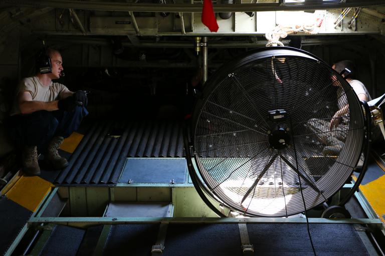 MAKE A MEME View Large Image Airlift Wing Maintenance Group members work in the tail of a C-130H Hercules on a hot day on the flightline, July 21, 2016, in Mansfield, Ohio. The members used an industrial sized fan to help cool the inside of the tail where the work ...
