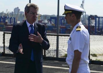 | Keywords: the honorable geoffrey r. pyatt thehonorablegeoffreyrpyatt u.s. ambassador to ukraine usambassadortoukraine commanding officer commandingofficer amphibious dock landing ship uss whidbey island lsd 41 amphibiousdocklandingshipusswhidbeyislandlsd41 dv tour dvtour distinguished visitor distinguishedvisitor odessa ukraine outdoor 160724-N-TI017-357 ODESSA, Ukraine (July 24, 2016) The Honorable Geoffrey R. Pyatt, U.S. ambassador to Ukraine, left, and Cmdr. Ethan Rule, commanding officer of the amphibious dock landing ship USS Whidbey Island (LSD 41), discuss the ship’s missions and capabilities on the flight deck July 24, 2016. Whidbey Island is participating in Exercise Sea Breeze 2016, an air, land and maritime exercise designed to improve maritime safety, security and stability in the Black Sea. (U.S. Navy photo by Mass Communication Specialist 2nd Class Nathan R. McDonald/Released) 160724-N-TI017-357 ODESSA, Ukraine (July 24, 2016) The Honorable Geoffrey R. Pyatt, U.S. ambassador to Ukraine, left, and Cmdr. Ethan Rule, commanding officer of the amphibious dock landing ship USS Whidbey Island (LSD 41), discuss the ship’s missions and capabilities on the flight deck July 24, 2016. Whidbey Island is participating in Exercise Sea Breeze 2016, an air, land and maritime exercise designed to improve maritime safety, security and stability in the Black Sea. (U.S. Navy photo by Mass Communication Specialist 2nd Class Nathan R. McDonald/Released) |