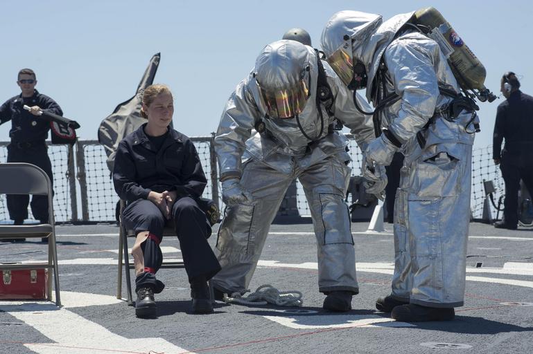 | Keywords: uss carney usscarney mediterranean sea mediterraneansea ctf 65 ctf65 outdoor people 160726-N-ZE250-081 MEDITERRANEAN SEA (July 26, 2016) – Crash and salvage team members Hotsuitmen simulate rescuing Midshipman 1st Class Amy Krick during a flight deck crash and salvage exercise aboard USS Carney (DDG 64) while on patrol in the Mediterranean Sea July 26, 2016. Carney, an Arleigh Burke-class guided-missile destroyer, forward deployed to Rota, Spain, is conducting a routine patrol in the U.S. 6th fleet area of operations in support of U.S. national security interests in Europe. (U.S. Navy photo by Mass Communication Specialist 3rd Class Weston Jones/Released) 160726-N-ZE250-081 MEDITERRANEAN SEA (July 26, 2016) – Crash and salvage team members Hotsuitmen simulate rescuing Midshipman 1st Class Amy Krick during a flight deck crash and salvage exercise aboard USS Carney (DDG 64) while on patrol in the Mediterranean Sea July 26, 2016. Carney, an Arleigh Burke-class guided-missile destroyer, forward deployed to Rota, Spain, is conducting a routine patrol in the U.S. 6th fleet area of operations in support of U.S. national security interests in Europe. (U.S. Navy photo by Mass Communication Specialist 3rd Class Weston Jones/Released) |