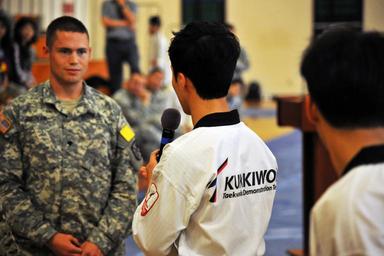 | Keywords: taekwondo u.s. army usarmy u.s. marine corps usmarinecorps u.s. navy usnavy u.s. air force usairforce presidio of monterey presidioofmonterey korea people The Kukkiwon Taekwondo Demonstration Team from Korea performed a traditional martial arts demonstration at the Presidio of Monterey, California, Price Fitness Center Aug. 3. The Defense Language Institute Foreign Language Center Korean School hosted the event. Following the demonstration, the team answered questions in Korean for the benefit of the students. Kukkiwon, known as the World Taekwondo Headquarters, is the center of taekwondo culture in Korea with teams touring about 120 countries as ambassadors of the traditional martial art for the past 40 years. (U.S. Army photo by Patrick Bray/Released) The Kukkiwon Taekwondo Demonstration Team from Korea performed a traditional martial arts demonstration at the Presidio of Monterey, California, Price Fitness Center Aug. 3. The Defense Language Institute Foreign Language Center Korean School hosted the event. Following the demonstration, the team answered questions in Korean for the benefit of the students. Kukkiwon, known as the World Taekwondo Headquarters, is the center of taekwondo culture in Korea with teams touring about 120 countries as ambassadors of the traditional martial art for the past 40 years. (U.S. Army photo by Patrick Bray/Released) |