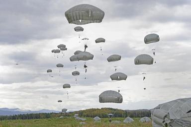 | Keywords: outdoor Paratroopers assigned to the 4th Infantry Brigade Combat Team (Airborne), 25th Infantry Division, U.S. Army Alaska, jump from a C-17 Globemaster III during a joint forcible entry exercise at Malemute Drop Zone on Joint Base Elmendorf-Richardson, Alaska, Aug. 23, 2016, as part of Exercise Spartan Agoge. Spartan Agoge is a brigade-level field training exercise that began Aug. 15, and focuses on an array of combat-related tasks from squad live-fire exercises to helicopter air insertion and airborne assault training. (U.S. Air Force photo by Airman 1st Class Valerie Monroy) Paratroopers assigned to the 4th Infantry Brigade Combat Team (Airborne), 25th Infantry Division, U.S. Army Alaska, jump from a C-17 Globemaster III during a joint forcible entry exercise at Malemute Drop Zone on Joint Base Elmendorf-Richardson, Alaska, Aug. 23, 2016, as part of Exercise Spartan Agoge. Spartan Agoge is a brigade-level field training exercise that began Aug. 15, and focuses on an array of combat-related tasks from squad live-fire exercises to helicopter air insertion and airborne assault training. (U.S. Air Force photo by Airman 1st Class Valerie Monroy) |