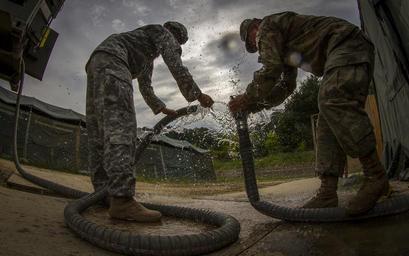 | Keywords: 339th quartermaster company 339thquartermastercompany korea ufg 16 ufg16 ulchi freedom guardian ulchifreedomguardian i corps icorps ken scar kenscar soldiers joint training jointtraining korean army koreanarmy army training armytraining yongin tents housing living quarters livingquarters camp yongin campyongin rok republic of korea republicofkorea 3rd rok 3rdrok troka water treatment specialist watertreatmentspecialist 3-39 quartermaster co. 339quartermasterco water water supply watersupply logistics gyeonggido [kyonggi-do] gyeonggidokyonggido south korea southkorea kr surreal animal U.S. Army Private 1st Class Andrew Skalecki, from Kansasville, Wi., and Spc. Jose Rodriquez of San Juan, Puerto Rico - both water treatment specialists with the 339th Quartermaster Co. - resupply the water for over 500 U.S. and Canadian soldiers staying in a tent village at Yongin, South Korea, from an LHS vehicle carrying 2,000 gallons of water, Aug. 25, 2016. (U.S. Army photo by Staff Sgt. Ken Scar) www.dvidshub.net U.S. Army Private 1st Class Andrew Skalecki, from Kansasville, Wi., and Spc. Jose Rodriquez of San Juan, Puerto Rico - both water treatment specialists with the 339th Quartermaster Co. - resupply the water for over 500 U.S. and Canadian soldiers staying in a tent village at Yongin, South Korea, from an LHS vehicle carrying 2,000 gallons of water, Aug. 25, 2016. (U.S. Army photo by Staff Sgt. Ken Scar) www.dvidshub.net |
