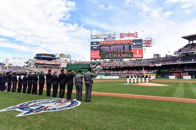 | Keywords: approved 160911-N-DY073-176 ANNAPOLIS, Md. (September 11, 2016) The United States Naval Academy (USNA) midshipmen and local first responders observe the USNA Color Guard during the opening ceremony of the Washington Nationals versus Philadelphia Phillies game. The United States Naval Academy midshipmen marched on the field during the opening ceremonies at the Washington Nationals game honoring those killed in the 9/11 attacks. (U.S. Navy photo by Mass Communication Specialist 3rd Class Brianna Jones/Released) 160911-N-DY073-176 ANNAPOLIS, Md. (September 11, 2016) The United States Naval Academy (USNA) midshipmen and local first responders observe the USNA Color Guard during the opening ceremony of the Washington Nationals versus Philadelphia Phillies game. The United States Naval Academy midshipmen marched on the field during the opening ceremonies at the Washington Nationals game honoring those killed in the 9/11 attacks. (U.S. Navy photo by Mass Communication Specialist 3rd Class Brianna Jones/Released) |