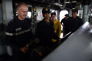 | Keywords: navy uss ross (ddg 71) ussrossddg71 ddg 71 ddg71 u.s. 6th fleet us6thfleet c6f ctf 65 ctf65 patrol mediterranean sea mediterraneansea rear adm. olivier lebas rearadmolivierlebas france indoor 160924-N-FP878-146 MEDITERRANEAN SEA (Sept. 24, 2016) French Rear Adm. Olivier Lebas, left, mans of the helm of USS Ross (DDG 71) during a tour Sept. 24, 2016. Ross, an Arleigh Burke-class guided-missile destroyer, forward-deployed to Rota, Spain, is providing multi-warfare defense support to Charles de Gaulle carrier-based operations in the Eastern Mediterranean against identified ISIL positions in support of Operation Inherent Resolve. (U.S. Navy photo by Mass Communication Specialist 1st Class Theron J. Godbold/Released) 160924-N-FP878-146 MEDITERRANEAN SEA (Sept. 24, 2016) French Rear Adm. Olivier Lebas, left, mans of the helm of USS Ross (DDG 71) during a tour Sept. 24, 2016. Ross, an Arleigh Burke-class guided-missile destroyer, forward-deployed to Rota, Spain, is providing multi-warfare defense support to Charles de Gaulle carrier-based operations in the Eastern Mediterranean against identified ISIL positions in support of Operation Inherent Resolve. (U.S. Navy photo by Mass Communication Specialist 1st Class Theron J. Godbold/Released) |