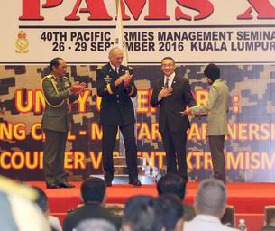 | Keywords: u.s. army pacific usarmypacific pacific armies management seminar pacificarmiesmanagementseminar #usarpac usarpac #pacom pacom pams xl pamsxl lt. gen. dato’ sri zulkiple ltgendato’srizulkiple gen. robert brown genrobertbrown kuala lumpur kualalumpur malaysia theater security theatersecurity minister of defence malaysia ministerofdefencemalaysia dato’ seri hishammuddin dato’serihishammuddin KUALA LUMPUR, Malaysia—Leaders from 30 of 34 Armies across the Indo-Asia-Pacific gathered in Kuala Lumpur, Malaysia Sept. 26 for the opening ceremony of the 40th Pacific Armies Management Seminar (PAMS XL) co-hosted by the Malaysian Army and U.S. Army Pacific. PAMS is the largest theater security and cooperation event co-hosted by USARPAC in terms of country participation and the role of co-host rotates to a different partner nation annually. The long-term objective of PAMS is to promote peace and stability in the Indo-Asia-Pacific region through mutual understanding, dialogue, and friendship Photo by Russell K. Dodson/released KUALA LUMPUR, Malaysia—Leaders from 30 of 34 Armies across the Indo-Asia-Pacific gathered in Kuala Lumpur, Malaysia Sept. 26 for the opening ceremony of the 40th Pacific Armies Management Seminar (PAMS XL) co-hosted by the Malaysian Army and U.S. Army Pacific. PAMS is the largest theater security and cooperation event co-hosted by USARPAC in terms of country participation and the role of co-host rotates to a different partner nation annually. The long-term objective of PAMS is to promote peace and stability in the Indo-Asia-Pacific region through mutual understanding, dialogue, and friendship Photo by Russell K. Dodson/released |