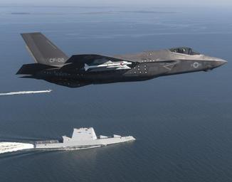 | Keywords: patuxent river patuxentriver maryland united states unitedstates us outdoor airplane aircraft vehicle An F-35 Lightning II Carrier Variant (CV) piloted by U.S. Marine Corps Maj. Robert "Champ" Guyette II, a test pilot from the F-35 Pax River Integrated Test Force (ITF) assigned to the Salty Dogs of Air Test and Evaluation Squadron (VX) 23, flies over the stealth guided-missile destroyer USS Zumwalt (DDG 1000) as the ship transits the Chesapeake Bay on Oct. 17, 2016. USS Zumwalt, the Navy's newest and most technologically advanced surface ship, joined the fleet Oct. 15. The F-35C Lightning II â a next generation single-seat, single-engine strike fighter that incorporates stealth technologies, defensive avionics, internal and external weapons, and a revolutionary sensor fusion capability â is designed as the U.S. Navyâs first-day-of-war, survivable strike fighter. The U.S. Navy anticipates declaring the F-35C combat-ready in 2018. (U.S. Navy photo by Andy Wolfe/Released) An F-35 Lightning II Carrier Variant (CV) piloted by U.S. Marine Corps Maj. Robert "Champ" Guyette II, a test pilot from the F-35 Pax River Integrated Test Force (ITF) assigned to the Salty Dogs of Air Test and Evaluation Squadron (VX) 23, flies over the stealth guided-missile destroyer USS Zumwalt (DDG 1000) as the ship transits the Chesapeake Bay on Oct. 17, 2016. USS Zumwalt, the Navy's newest and most technologically advanced surface ship, joined the fleet Oct. 15. The F-35C Lightning II â a next generation single-seat, single-engine strike fighter that incorporates stealth technologies, defensive avionics, internal and external weapons, and a revolutionary sensor fusion capability â is designed as the U.S. Navyâs first-day-of-war, survivable strike fighter. The U.S. Navy anticipates declaring the F-35C combat-ready in 2018. (U.S. Navy photo by Andy Wolfe/Released) |