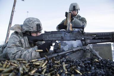 | Keywords: m240b machine gun m240bmachinegun 673rd security forces squadron 673rdsecurityforcessquadron live fire livefire joint base elmendorf-richardson jointbaseelmendorfrichardson alaska united states unitedstates us outdoor U.S. Air Force Senior Airman Kevin Kelly, left, and Airman 1st Class Isaiah McKee, both installation entry controllers assigned to the 673rd Security Forces Squadron, operate a M240B machine gun during live fire training at Grezelka range, Joint Base Elmendorf-Richardson, Alaska, Oct. 27, 2016. The security forces Airmen fired M240B machine guns to hone their proficiency. Kelly and McKee are natives of Chepachet, R.I. and Columbus, Ohio, respectively. (U.S. Air Force photo/Alejandro Pena) U.S. Air Force Senior Airman Kevin Kelly, left, and Airman 1st Class Isaiah McKee, both installation entry controllers assigned to the 673rd Security Forces Squadron, operate a M240B machine gun during live fire training at Grezelka range, Joint Base Elmendorf-Richardson, Alaska, Oct. 27, 2016. The security forces Airmen fired M240B machine guns to hone their proficiency. Kelly and McKee are natives of Chepachet, R.I. and Columbus, Ohio, respectively. (U.S. Air Force photo/Alejandro Pena) |