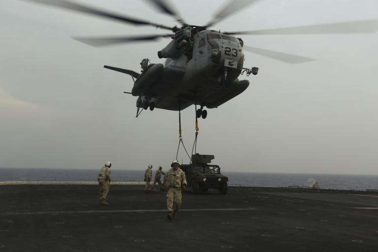 | Keywords: usmc marine corps marinecorps marines combat camera combatcamera comcam 22 meu 22meu meu marine expeditionary unit marineexpeditionaryunit general africom commander 4 star 4star africa waldhauser uss wasp (lhd 1) usswasplhd1 red sea redsea vehicle aircraft outdoor rotor blade A CH-53E with 22nd Marine Expeditionary Unit (MEU) lifts a vehicle off the flight deck of the amphibious assault ship USS Wasp (LHD 1) in the Red Sea, Nov. 9, 2016. The 22nd MEU, deployed with the Wasp Amphibious Ready Group, is conducting naval operations in support of U.S. national security interests in the 5th Fleet area of operations. (U.S. Marine Corps photo by Cpl. John A. Hamilton Jr.) www.dvidshub.net A CH-53E with 22nd Marine Expeditionary Unit (MEU) lifts a vehicle off the flight deck of the amphibious assault ship USS Wasp (LHD 1) in the Red Sea, Nov. 9, 2016. The 22nd MEU, deployed with the Wasp Amphibious Ready Group, is conducting naval operations in support of U.S. national security interests in the 5th Fleet area of operations. (U.S. Marine Corps photo by Cpl. John A. Hamilton Jr.) www.dvidshub.net |