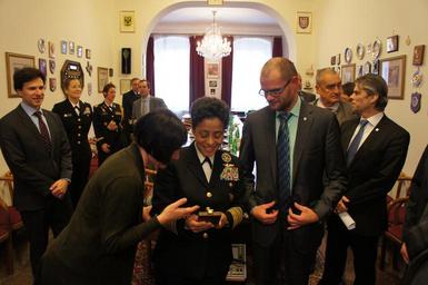 | Keywords: indoor 161207-N-N0901-042 PRAGUE (Dec. 7, 2016) Commander, U.S. Naval Forces Europe-Africa, Adm. Michelle J. Howard, center, is presented a gift from members of the Czech Republic Parliament in Prague, Dec. 7, 2016. U.S. Naval Forces Europe-Africa, headquartered in Naples, Italy, oversees joint and naval operations, often in concert with allied, joint, and interagency partners, to enable enduring relationships, and increase vigilance and resilience in Europe and Africa. (U.S. Navy Photo/Released) 161207-N-N0901-042 PRAGUE (Dec. 7, 2016) Commander, U.S. Naval Forces Europe-Africa, Adm. Michelle J. Howard, center, is presented a gift from members of the Czech Republic Parliament in Prague, Dec. 7, 2016. U.S. Naval Forces Europe-Africa, headquartered in Naples, Italy, oversees joint and naval operations, often in concert with allied, joint, and interagency partners, to enable enduring relationships, and increase vigilance and resilience in Europe and Africa. (U.S. Navy Photo/Released) |