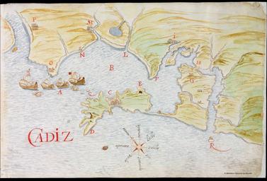 | Keywords: 1632 Cardona Descripcion Indias (5).jpg bahía de Cádiz Primer mapa página 5 de las Descripciones geográphicas e hydrográphicas de muchas tierras y mares del Norte y Sur en las Indias en especial del descubrimiento del Reino de la California redactadas por el capitán Nicolás de Cardona tras su expedición de 1614 s of many northern and southern lands and seas in the Indies specifically the discovery of the kingdom of California written by captain Nicolás de Cardona after his expedition of 1614 1632-06-24 Descripciones geográficas e hidrográficas de muchas tierras y mares del Norte y Sur en las Indias en especial del descubrimiento del Reino de California hecho con trabajo e industria por el capitán y cabo Nicolás de Cardona dirigidas al Exmo D Gaspar de Guzmán Conde de Olivares http //bdh bne es/bnesearch/detalle/bdh0000011007 Biblioteca Digital Hispánica Biblioteca Nacional de España Nicolás de Cardona other versions PD-Art Descripciones geográphicas e hydrográphicas de muchas tierras y mares del Norte y Sur en las Indias en especial del descubrimiento del Reino de la California Maps by Nicolás de Cardona Watercolor maps Maps in Spanish Pictorial maps 1632 maps Old manuscript maps Bay of Cádiz Old maps of Cádiz |