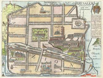 | Keywords: 1650 Fuller Map of Jerusalem ( Israel, Palestine, Holy Land) - Geographicus - jerusalem-fuller-1650.jpg An extremely rare and altogether fascinating 1650 map of Jerusalem by Thomas Fuller Depicts the old walled city of Jerusalem during the reign of the Biblical King Solomon ca 961-922 BC On the whole this is a highly imaginative map of the city and likely bears no significant resemblance to the Jerusalem of Solomon Solomon's Temple appears at the right center with a tall bell tower and a highly Renaissance European design aesthetic At the center roughly where the Church of Holy Sepulture is located today is Solomon's menagerie The Baths of Bethesda in which an angel swims appear in the upper right approximately where they are said to be today Other sites of note include Domus David near the modern day Jaffa Gate the armory in the lower left the Kings House at bottom center Solomon's throne near the menagerie at center the golden gate at right center etc Throughout the streets are arranged with an uncanny geometric precisions Outside the walls Fuller identifies the Mount of Olives Montis Oliueti the Dragon Well the Fullers Field the King's Garden and despite purportedly being a map of Solomon's Jerusalem the Crucifixion on Calvary A armorial crest and a dedication to Eduardo Montagu or Edward Montagu the First Earl of Sandwich appears in the upper right quadrant Engraved by John Williams for the 1650 first edition of Thomas Fuller's A Pisgah-sight of Palestine This map is exceptionally rare and an important addition to any serious Israel - Palestine - Holy Land collection We have found no record of it appearing on the market in the last 10 years 1665 undated Size in 15 11 5 object history credit line accession number jerusalem-fuller-1650 Fuller Thomas <i>Pisgah-Sight Of Palestine And The Confines Thereof With The History of the Old and New Testament acted thereon </i> 1650 Geographicus-source PD-Art-100 Old maps of Jerusalem Thomas Fuller 1665 maps Salahi Bimarstan Jerusalem |