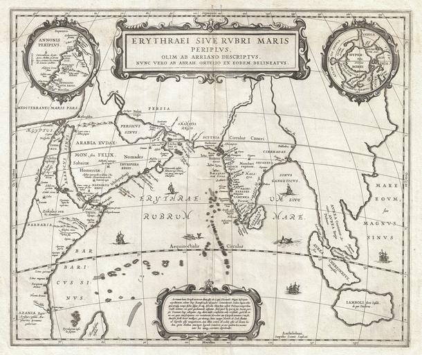 Keywords: 1658 Jansson Map of the Indian Ocean (Erythrean Sea) in Antiquity - Geographicus - ErythraeanSea-jansson-1658.jpg Artwork of the region heavily on records from Alexander the Great's conquests Two smaller maps in the upper left and right quadrants are of exceptional interest The upper left chart shows northwestern Africa and is titled Annonis Periplus This is a reference to the legendary expeditions of the Carthaginian King Hanno said to have been the first to access the Indian Ocean by sailing around the southern tip of Africa Incidentally en route he is also said to have been the first to tame a lion The upper right chart shows the northern polar regions as they were perceived at the time A landmass covering the polar ice cap is indentified as Hyperborea To the left of this roughly where North America rests today the island of Atlantis appears; while Scythia Europe Thule and Asia are on the right Greenland and possibly Iceland appear at the bottom This map is intended to point out the possibility of a Northeast Passage to Asia which was at the time being actively sought after by Dutch English and Russian navigators Both smaller maps the primary title area at top center and an Latin explanation for the map at bottom center are surrounded by baroque strapwork style borders This remarkable map was published in volume six the Orbis Antiquus of Jan Jansson's Novus Atlas 1658 undated Size in 19 16 object history credit line accession number ErythraeanSea-jansson-1658 Jansson J <i>Novus Atlas Sive Theatrum Orbis Terrarum In quo Orbis Antiquus Seu Geographia Vetus Sacra Profana exhibetur</i> Volume 6 1658 Geographicus-source PD-old-100 Maps by Jan Jansson Old maps of the Indian Subcontinent Old maps of the Arctic 1650s maps of Africa Maps in Latin Old maps of phantom islands Old maps of the Indian Ocean 1658 maps of India Periplus of the Erythraean Sea |