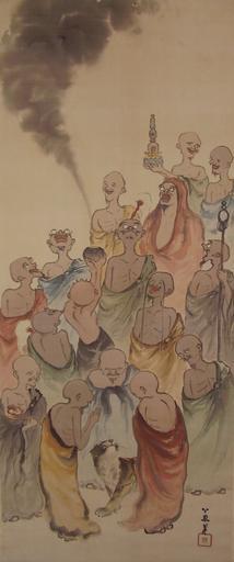 | Keywords: 16 Arhats.aka.Luohans.a.k.a.Juroku Rakan.wittig.collection.detail.edited.working.print.01..jpg en Painting of the 16 Arhats/Arhants/Luohans a k a Juroku Rakan; they are depicted with various associated symbolic items; done in a gentle caricature style; late 19th to early 20th century Japanese Signed sealed artist not yet identified Each arhat is probably intended to be individually identifiable through their actions associated objects For example the red-hooded figure in the top right quadrant is Bodhidarma/Daruma Edited version cropped intended as a working print for use in wikipedia articles etc 2011-04-17 photo by original uploader original artist not yet identified an image set of this painting is pending help is needed in identifying/translating the artist's markings signature seal help is needed in identifying each of the 16 figures as a specific individual arhat out of the designated 16 this is a working print intended for use in wikipedia articles etc please feel free to upload an improved version PD-Art-100 Uploaded with UploadWizard 16 Arhats Paintings from Japan Paintings on scrolls from Japan |