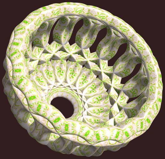 Keywords: mathematica 3d cg parametricplot3d texture torus 輪環 りんかん ドーナツ どーなつ 四芒星 しぼうせい 四光星 しこうせい 四稜星 しりょうせい code program algorithm コード プログラム アルゴリズム geometric sculpture geometricsculpture shape geometry sculpture mapping テクスチャ マッピング 模様 もよう abstract 抽象 ちゅうしょう アブストラクト design pattern デザイン パターン graphic グラフィック グラフィクス structure 意匠 構造 symmetry 対称性 たいしょうせい シンメトリー 対称 たいしょう algorithm コード black background organic pattern round photo border a = 8; (* center hole size of a torus *) b = 4; (* tetra-torus *) c = -8; (* distance from the center of rotation *) d = 16; (* number of torus *) h = 1; (* height of a torus *) SetOptions[ParametricPlot3D, PlotRange -> Full, Mesh -> None, Boxed -> False, Axes -> False, PlotPoints -> 300, ImageSize -> 3000, Background -> RGBColor[{50, 30, 30}/255], PlotStyle -> Directive[Specularity[White, 70], Texture[Import["D:/tmp/864.jpg"]]], TextureCoordinateFunction -> ({#4, #5 2 Pi} &), Lighting -> "Neutral"]; f[v_] := Sin[2 Sin[Sin[Sin[v]]]]; x = (a - Cos[t] - Sin[b s]) Cos[s + Pi/(2 b)]; y = (a - Cos[t] - Sin[b s]) Sin[s + Pi/(2 b)]; z = (f[t] - h f[b s]) + c; rm = Table[{x, y, z}.RotationMatrix[2 i Pi/d, {1, 1, 1}], {i, d}]; ParametricPlot3D[rm, {t, 0, 2 Pi}, {s, 0, 2 Pi}] (*--- The Texture *) a = 8; (* center hole size of a torus *) b = 4; (* tetra-torus *) c = -8; (* distance from the center of rotation *) d = 16; (* number of torus *) h = 1; (* height of a torus *) SetOptions[ParametricPlot3D, PlotRange -> Full, Mesh -> None, Boxed -> False, Axes -> False, PlotPoints -> 300, ImageSize -> 3000, Background -> RGBColor[{50, 30, 30}/255], PlotStyle -> Directive[Specularity[White, 70], Texture[Import["D:/tmp/864.jpg"]]], TextureCoordinateFunction -> ({#4, #5 2 Pi} &), Lighting -> "Neutral"]; f[v_] := Sin[2 Sin[Sin[Sin[v]]]]; x = (a - Cos[t] - Sin[b s]) Cos[s + Pi/(2 b)]; y = (a - Cos[t] - Sin[b s]) Sin[s + Pi/(2 b)]; z = (f[t] - h f[b s]) + c; rm = Table[{x, y, z}.RotationMatrix[2 i Pi/d, {1, 1, 1}], {i, d}]; ParametricPlot3D[rm, {t, 0, 2 Pi}, {s, 0, 2 Pi}] (*--- The Texture *) |