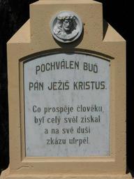 | Keywords: 16. kříž u hráze- Sedláčkův detail text.JPG cs Teracový kříž 2 Původně tento kříž býval na mlýnské cestě z Dukovan do dukovanského mlýna- nyní zatopeno a kříž přemístěn Nápisy na kříži Pochválen buď Pán Ježíš Kristus Co prospěje člověku byť celý svět získal a na své duši zkázu utrpěl Ke cti a chvále Boží věnovali manželé Antonín a Marie Sedláčkovi majitelé mlýna L P 1934 own Obecdukovany 1934 Crosses in Vysočina Region Dukovany | ||||