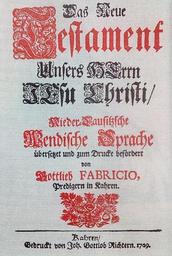 | Keywords: Новый Завет Фабрициуса 1709.jpg ru Титульный лист пе вого нижнелужицкого пе евода ового Завета Богумила Фаб ициуса 1709 1709 Serbske stawizny 1 Domowina 2009 ISBN 978-3-7420-1385-9 ст 65 Johann Gottlieb Fabricius 1681-1741 other versions PD-old-70-1923 Sorbian bibles |
