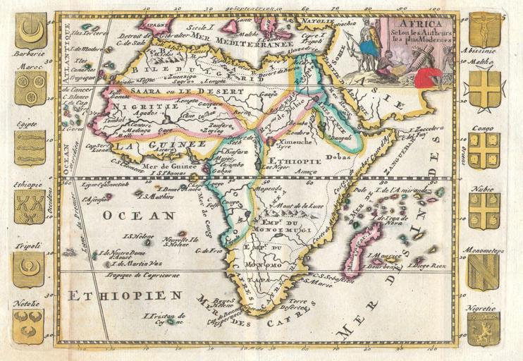| Keywords: 1710 De La Feuille Map of Africa - Geographicus - Africa-lafeuille-1710.jpg A very scarce c 1710 map of Africa by Daniel de la Feuille Depicts the continent of Africa form an early 18th century perspective The Niger River is mapped with surprising accuracy especially considering its highly inaccurate mappings nearly 100 years later in the 19th century The Mountains of the Moon supposed source of the Nile are located considerably south of where they appear in other maps of the period Early Ptolemaic maps do note these mountains as well as two large lakes just to the north Though the Mountains are present both of these lakes are absent indicating an interesting evolution away from the Ptolemaic conception in African cartography In southern Africa to large empires are named Monoemugi and Monomotapa This is the great southern African gold mining region and these names are likely taken from the names of prominent Congolese tribal rulers Surrounding the map are the curious addition of twelve armorial crests Crests include those of both Arab and African powers in the region including Barbarie Maroc Morocco Egypt Tripoli Notolie Malta Congo Nubia Monomotape and Nigreitie Many of these kingdoms and their associated armorial crests are purely conjectural Ethiopia for example is indicated as distinct from Abyssinia with two separate crests both unrelated to any actual crests that the kingdom seems to have used The allegorical title cartouche in the upper right quadrant features several Africans cooking over a fire while an Impala or Antelope looks on This map was originally prepared for inclusion as chart no 5 in the 1702 edition of De la Feuille's Atlas Portatif This map is from the later 1710 edition 1710 Size in 8 5 5 object history credit line accession number Africa-lafeuille-1710 Geographicus-source PD-old-100 Daniel de La Feuille Africa 1710 maps Africa 1710s maps of Africa Maps in French Africa |