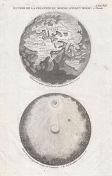 | Keywords: 1728 Calmet Map of the Ancient World Showing the Creation of the Universe - Geographicus - AncientWorld-calmet-1728.jpg A curious c 1728 mapping of the ancient world and the cosmos rendered from an arcane Biblical perspective Though composed well after the discovery of the New World and the circumnavigations of Magellan and Drake this two part diagram represents a very medieval view of the world The upper map though ostensibly the Eastern Hemisphere actually follows a medieval doctrine advocated by Francis Bacon That is the belief that the physical earth was large ball of rock resting within a great sphere of water The habitable lands of the earth Asia Europe and Africa were pieces of this rock that emerged from the waters when God caused the ball of rock Earth to float in the northern part of the watery sphere - much as a baseball might float in a bucket of water This argument was used in the middle ages to prove that the antipodes or the lands south of the equator must not emerge from the sea for necessarily if the earth is floating at the northern part of the watery sphere the southern parts must be covered fully by deep seas Hence the darker shading indicating fathomless depths in the southern parts of the map The lower sphere depicts the cosmos from a pre-Copernican perspective Earth rests at the center of the universe around which the Moon Sun here drawn as benevolent God and the stars rotate The curious diagram was included in Augustin Calmet's influential 18th century Biblical dictionary 1728 undated Size in 8 12 5 object history credit line accession number AncientWorld-calmet-1728 Calmet Augustin <i>Dictionnaire Historique Critique Chronologique Geographique de la Bible</i> 1728 Geographicus-source PD-Art-100 Maps by Antoine Augustin Calmet 1728 maps 1720s maps of the world Geocentric model Maps in French Biblical maps |