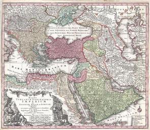 | Keywords: 1730 Seutter Map of Turkey (Ottoman Empire), Persia and Arabia - Geographicus - MagniTurcarum-seutter-1740.jpg A spectacular c 1730 map of the Ottoman Empire including Greece Turkey Persia Egypt and Arabia by the important Augsburg map publisher Gerog Matthaus Seutter Depicts from Italy eastward to the Caspian Sea which is depicted in its entirety Includes Crimea and the Caucuses Georgia Circassia and Armenia Extends south to include all of Arabia and the northern tip of the Horn of Africa Generally accurate with a few cartographic anomalies The Dead Sea is over-large and misshapen A large and nonexistent lake appears just west of the Nile Delta In the lower left hand quadrant there is a large decorative title cartouche attributed to the Augsburg silversmith Abraham Drentwet Depicts the ottoman Emperor gloriously robed with and enthroned On the ground before him two men bow and offer hum treasures The images on the right of the title offer a more allegorical references and include an European holding a globe a lion the Rod of Asclepius a Medusa head shield and s spear Angels with trumpets look on from above A map key appears in the lower right quadrant Cartographically similar to Visscher's 1690 map of the same area This is a rather unusual state of the map and one of the few examples wherein S G Maj Geogr Aug follows Seutter's name in the title cartouche The only comparable example we have found is in the British Museum circa 1730 undated Size in 23 20 object history credit line accession number MagniTurcarum-seutter-1740 <i>Atlas Novus Matthaeso Seutter </i> 1730 Geographicus-source PD-art-100 Maps by Seutter Ottomanenreich 1730 maps Seutter Ottomanenreich Maps in Latin Seutter Ottomanenreich Old maps of the Middle East 1730 Seutter Ottomanenreich Old maps of Greece 1730 Seutter Ottomanenreich Old maps of the Caucasus 1730 Seutter Ottomanenreich Old maps of the Ottoman Empire 1730 Seutter Old maps showing the whole Near East 1730 Seutter Ottomanenreich Turcomania Arabia Petra Egypt الحوراء Tabuc Maps of Sinai Old maps of Egypt Madian Lariffa Maps of Midian |