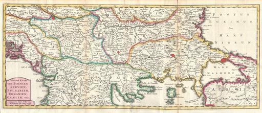 | Keywords: 1738 Ratelband Map of the Balkans ( Bosnia, Serbia, Bulgaria, Rumania ) - Geographicus - Balkans-lafeuille-1738.jpg This is a rare and unusual 1738 map of the Balkans by J Ratelband Likely revised and updated from earlier charts by the De La Feuille family Depicts from modern day Albania Dalmatia eastward through Bosnia Serbia Bulgaria and Rumania to the Black Sea Pontus Euxinus Extends south as far as modern Greece and includes parts of Asia Minor in the lower right quadrant Prominently labels the cities of Constantinople Istanbul Andrinopoli Belgrade and Sophia Curiously the location of the ancient city of Troy is also labeled with considerable accuracy considering that it was supposedly lost until Heinrich Schliemann discovered it in 1870 Dutch title cartouche in the lower left quadrant This map was originally prepared for inclusion as chart no 1738 Size in 16 25 7 object history credit line accession number Balkans-lafeuille-1738 Geographicus-source PD-old-100 Daniel de La Feuille Balkans Johannes Ratelband 1738 maps Balkans 18th-century maps of the Balkans Maps in Dutch Balkans Sea of Marmara Kingdom of Serbia 1718 “1739 |